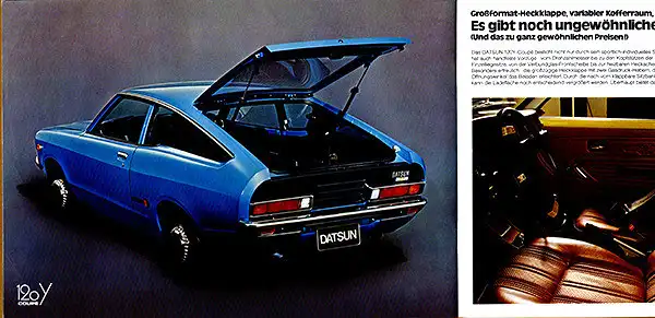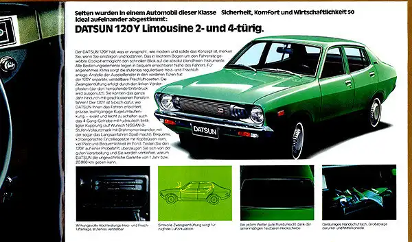 Oldtimer Nissan Datsun 120 Y Limosine und Coupe Typen Technik Ausstattung großformatiger mehrseitiger Modell Prospekt um 1978