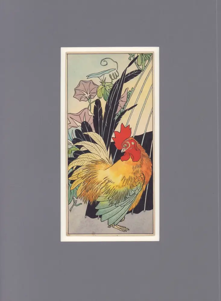 Titel: Japanische Tuschzeichnung [Prächtiger Hahn im Profil vor blühenden Winden und einem mit Tuch bespannten Paravent]. Feder und Aquarell, anonym