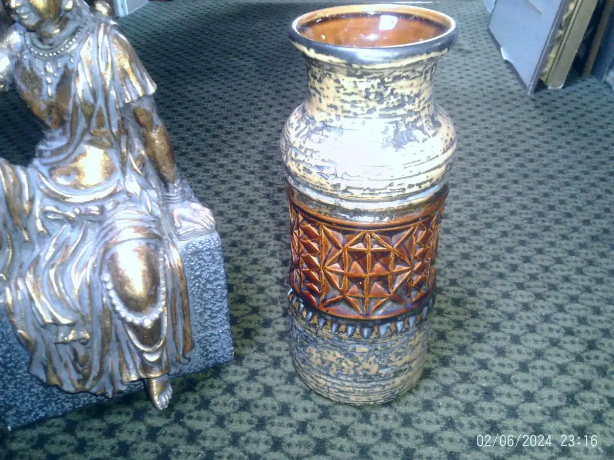 Neben diesen Stücken gelang es Jasba, eine Reihe interessanter Vasen mit genau der richtigen Kombination aus Farbe, gegossenem Muster oder Form herzustellen, entweder mit einer geradlinigen Form und einem glatten und schlichten Dekor oder einer komplexeren Form, vielleicht mit einem gegossenen Muster und genau der passenden Farbe. Jasba verwendete nicht viele Lava- oder andere strukturierte Glasuren. Das Unternehmen experimentierte besonders mit Formen und gegossenen Mustern. Die Vielfalt ist wirklich erstaunlich, und mit einer guten Jasba-Vase besitzt man ein wirklich hervorragendes Stück westdeutscher Kunstkeramik. Lassen wir die mittelmäßigen in Ruhe, und natürlich wurden viel zu viele Vasen hergestellt, um sie alle richtig hinzubekommen, aber selbst die seltsamen, die ich im Beitrag über die Kugelvase besprochen habe , haben etwas Besonderes. Jasba muss man manchmal zweimal anschauen.