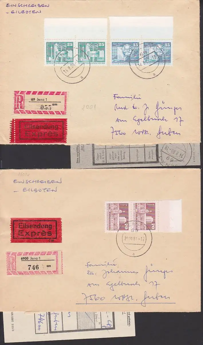 Jena R-Eil-Brief nach Guben, rs. Eing-St. Wilhem-Pieck-Stadt Guben, dabei 70 Pfg. im Paar (2602) (dc30035)