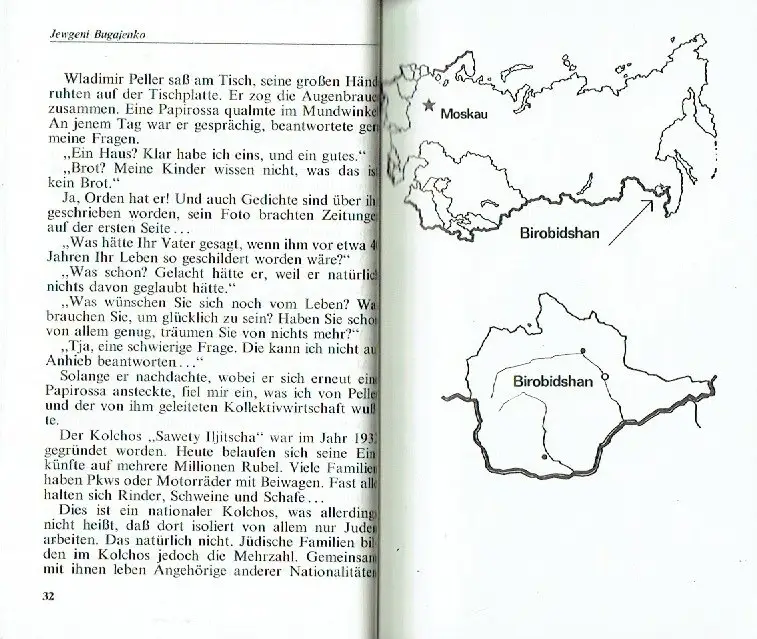guter bis sehr guter Zustand, geringe Gebrauchs- und Alterungsspuren: 3 Blatt unten mit Eselsohr - Deckelfalz etwas abgenutzt, EIN ABSTECHER IN DIE GESCHICHTE Das mit einem Territorium von 36 000 Quadratkilometern und mit über 200 000 Einwohnern im Süden des Sowjetischen Fernen Ostens gelegene Jüdische Autonome Gebiet gehört zur Region Chabarowsk (RSFSR), die sich wiederum über eine Fläche von 824 600 Quadratkilometern erstreckt. Von Chabarowsk bis Birobidshan sind es 40 Flugminuten. Während in Chabarowsk ein kalter Wind vom Amur herwehte und die Frühlingswolken entweder Regen oder Schnee ankündigten, lachte uns in Birobidshan ein sonniger Frühlingstag entgegen. Durch die Scholem-Alejchem-Straße rannten Schüler mit aufgeknüpften Mänteln und Jacken. Der Wetterkontrast zu dem naheliegenden Chabarowsk ist leicht erklärbar. Gebirgsketten und Waldmassive schützen das in den gleichen Breitengraden wie Prag, Wien, München und Paris liegende Gebiet vor kalten Winden. In den Wäldern, die ein Drittel des gesamten Territoriums bedecken, gibt es Pilze, Nüsse und Beeren im Überfluß. Wie in einem Märchenwald wachsen hier die Lärche, die sonst im Norden zu Hause ist, und der Südländische wilde Wein, der Korkbaum, auch Amur-Samt genannt, und die königliche Lotosblume nebeneinander ... - Ein Abstecher in die Geschichte - Ein Interview mit Mark Kaufmann - Begegnung in der Redaktion des "Birobidshaner Stern" - Der Birobidshaner Mähdrescher - Jefim Lanzmann, einer aus der Arbeiterklasse - Das ganz persönliche Glück des Wladimir Peller - Geschicke einfacher Menschen - Onkel Mischa, der König der Birobidshaner Friseure - Der jüngste Sohn der Familie Blechmann - Das Anliegen der Vera Glejser - Ein Festival im Kulturhaus - Ein Sonnabend in der Birobidshaner Synagoge - Besser einmal sehen... - Statt einer Schlussbemerkung, kartoniert, ca. 10,5 x 16,5, 79 Seiten mit zahlreichen Bildern