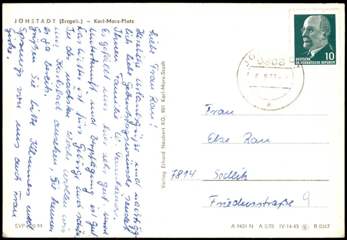 Jöhstadt (Erzgebirge) Denkmal, Karl-Marx-Platz zur DDR-Zeit 1972