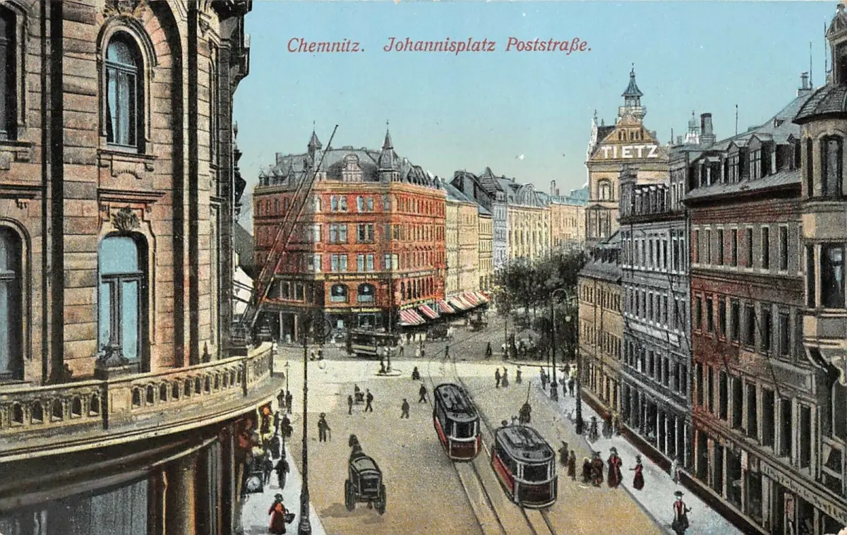 Johannisplatz mit Poststraße und Straßenbahn in Chemnitz Sachsen AK 1913