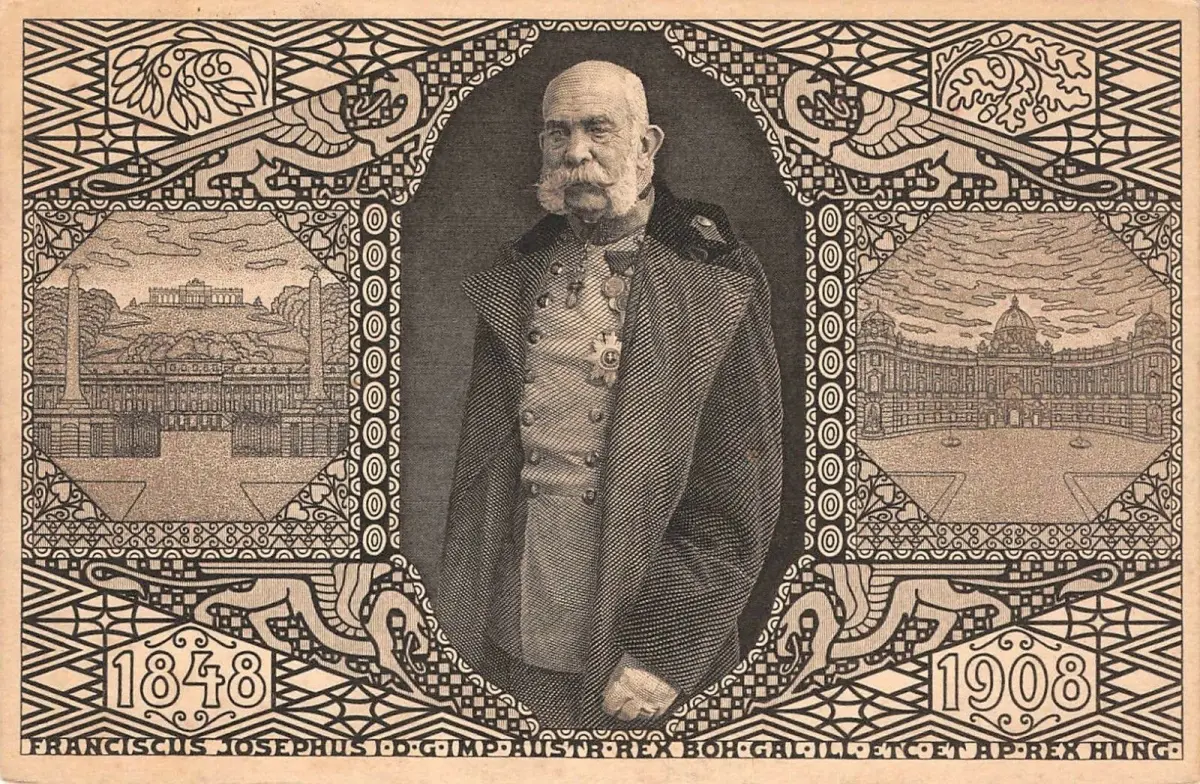 Jubiläumskarte mit Portrait Kaiser Franz Joseph Patriotika Postkarte AK 1908