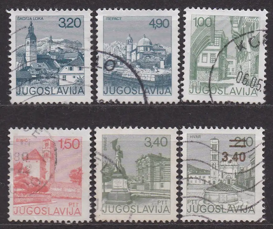 Jugoslawien, Mi-Nr. 1597, 1646, 1661, 1662, 1694 + 1738 gest., Sehenswürdigkeiten