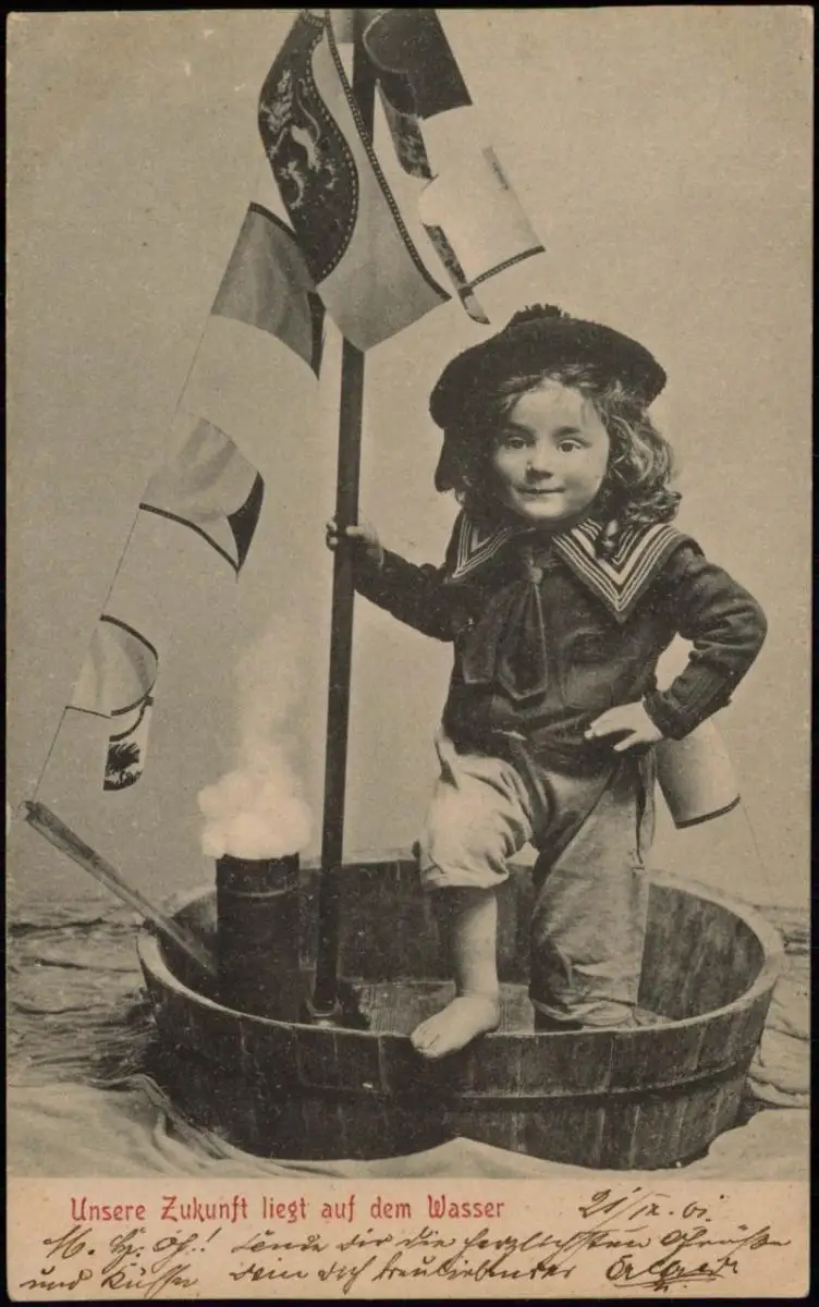 Junge in Badewannenboot Patriotika Unsere Zukunft liegt auf dem Meer 1901