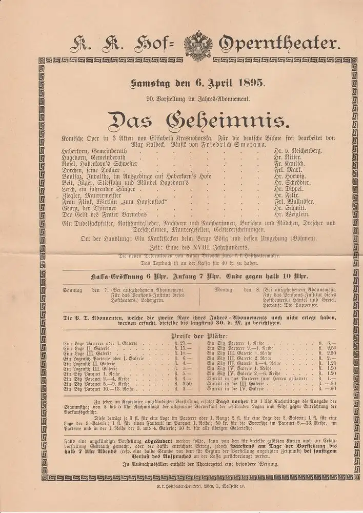 K. K. Hof = Operntheater: Theaterzettel Friedrich Smetana DAS GEHEIMNIS Samstag 6. April 1895.