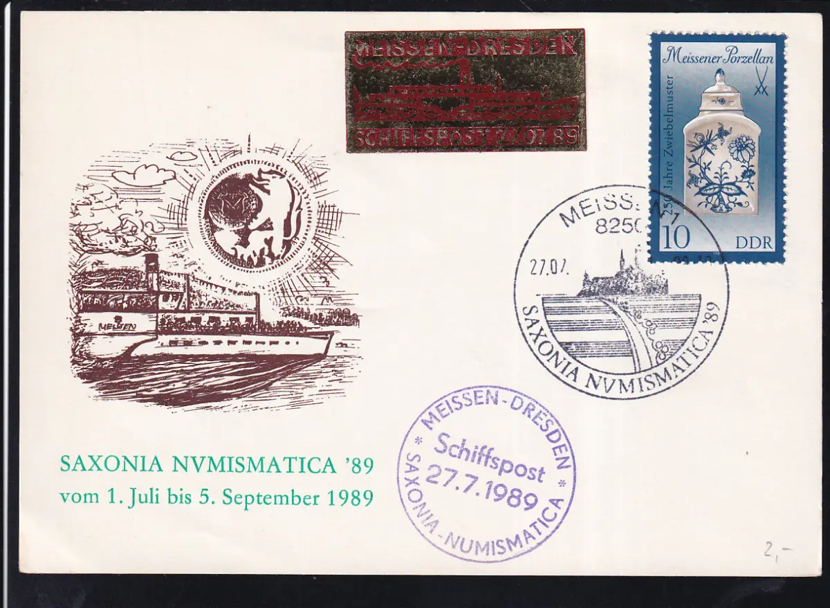 K1 MEISSEN-DRESDEN SAXONIA NUMISMATICA Schiffspost 27.7.1989 auf Sonderpostkarte