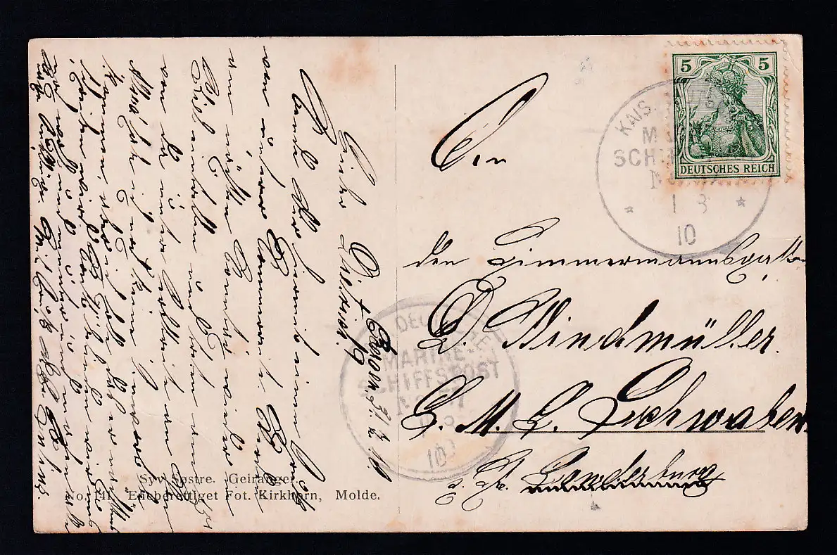 KAIS. DEUTSCHE MARINE No. 57 1.8.10 (= SMS Schlesien) auf AK (Syv Sostre Geiranger)