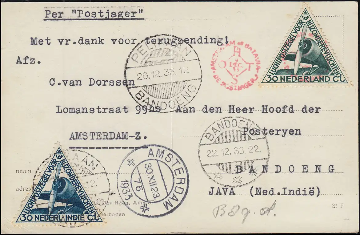 KLM-Flugpost Postjager/Pelikaan Amsterdam-Bandoeng-Amsterdam PH-OST 9.12.1933