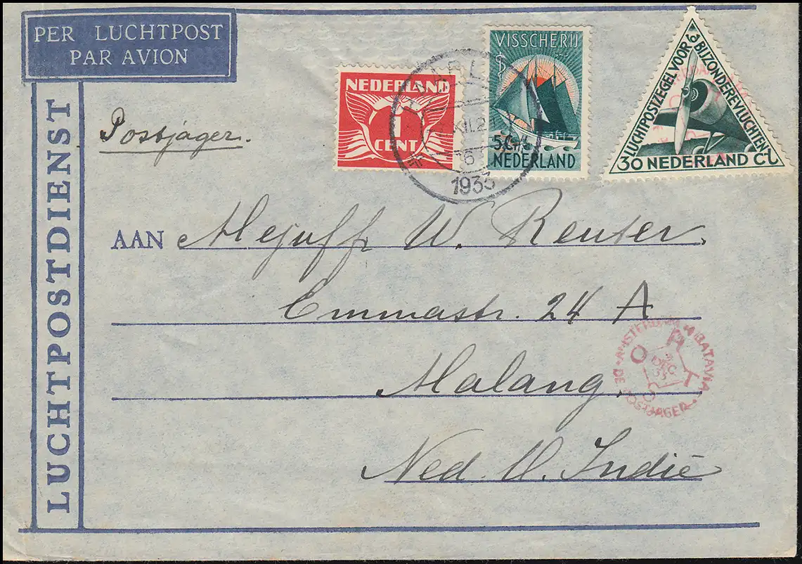 Mit rotem Bordstempel "AMSTERDAM-BATAVIA 9.12.33 PH-OST DE POSTJAGER". - Notlandung in Brindisi. Weiterbeförderung mit Imperal Airways nach Kairo, mit KLM Einvogel nach Jodphoer und per Pelikaan nach Batavia. Befördert nach Malang mit traditionellen Verkehrsmitteln; Ankuft 23.12.33.