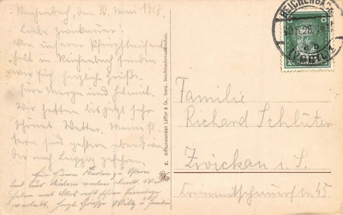 Rückseite: gelaufen 1928 von Reichenbach (Vogtl.)