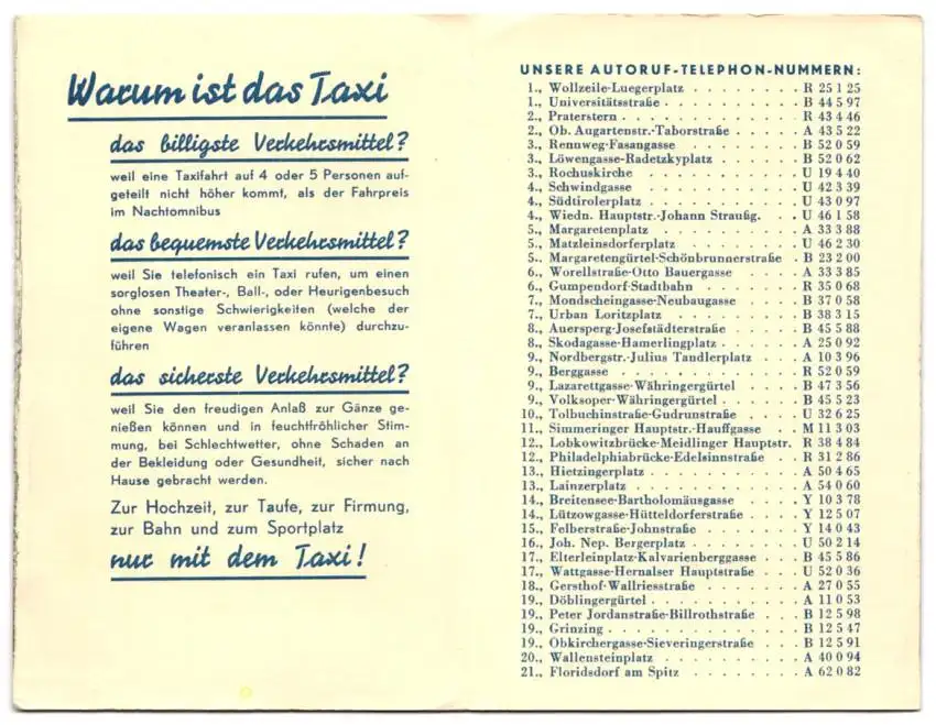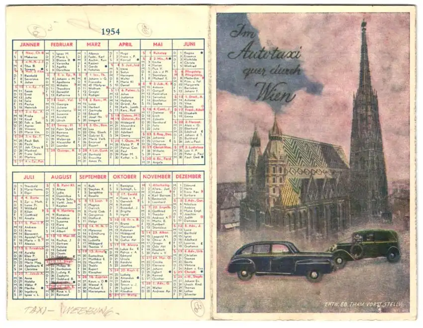 Kalender 1954, Reklame für Taxi-Unternehmen, Im Autotaxi quer durch Wien, Autos & Stephansdom