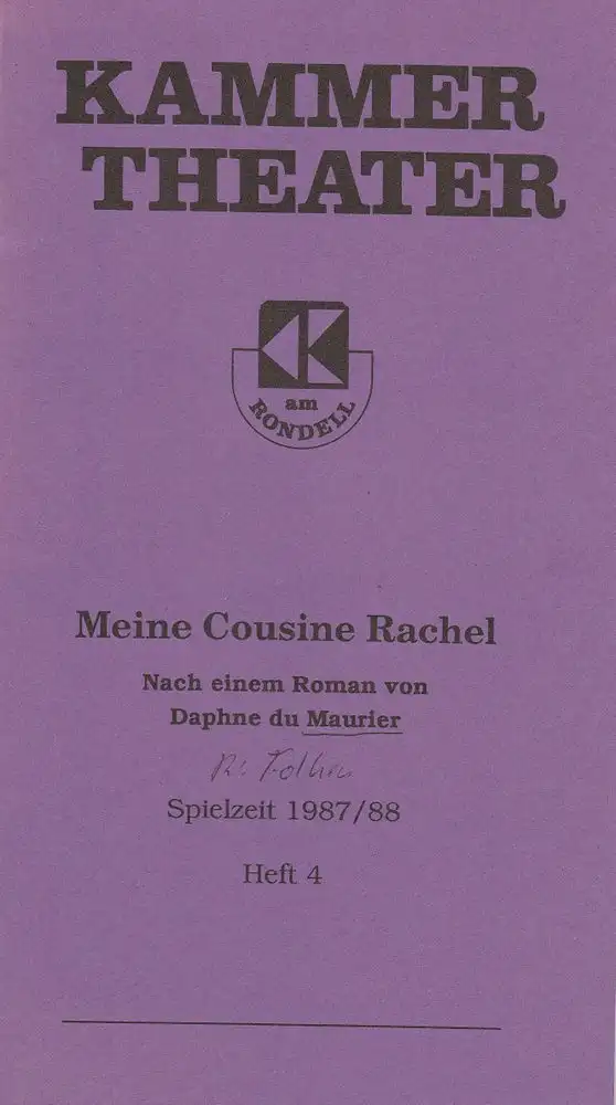 Kammertheater Karlsruhe, Wolfgang Reinsch: Programmheft Meine Cousine Rachel Spielzeit 1987 / 88 Heft 4.