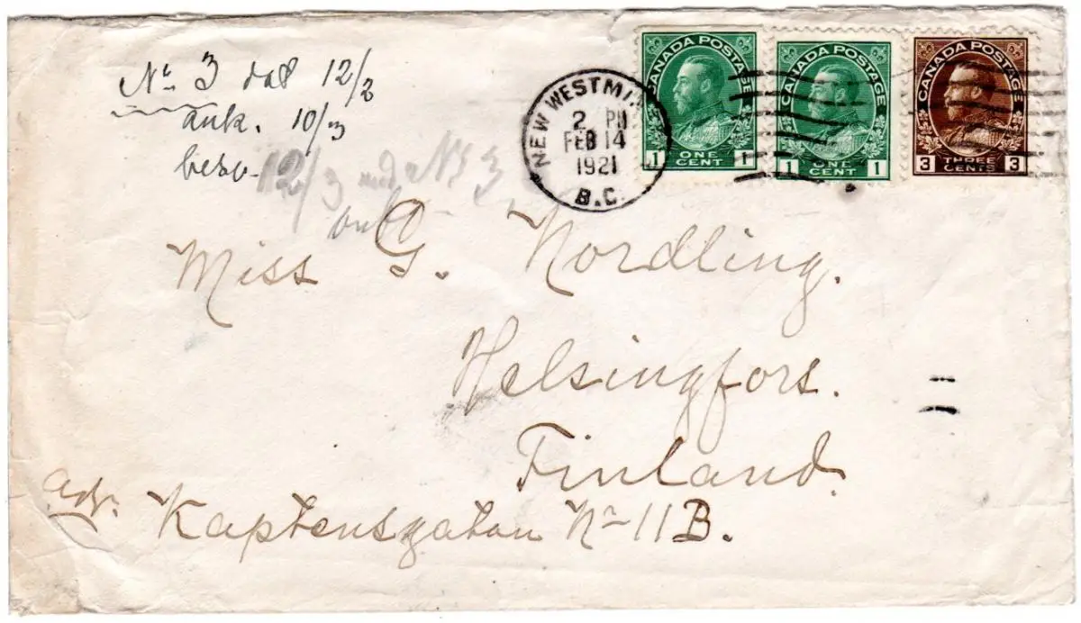 Kanada 1921, 3+2x1 C. auf Brief v. New Westminster n. Finnland. Destination!