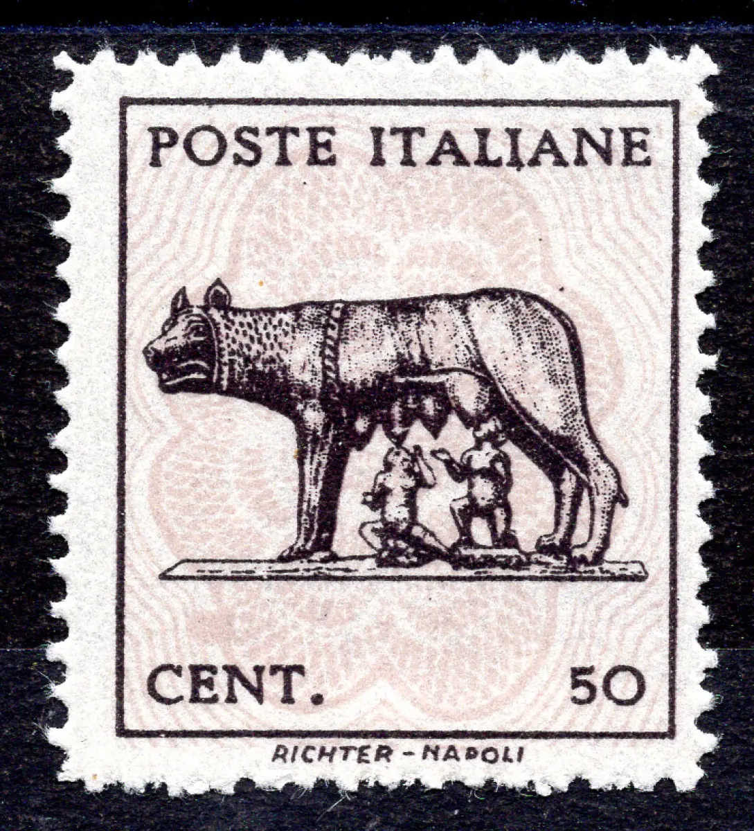 Kapitolinischer Wolf - Farbvariante braun statt lila ohne Gummi - Lupa Cent. 50 n. 515A ohne Wasserzeichen mit Lupendruck in der Mitte braun statt lila - auffällig und ungewöhnlich Cod.1181/WEB