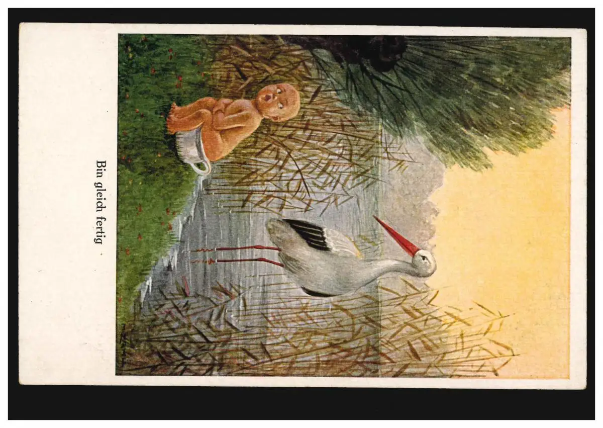 Karikatur-AK Bin gleich fertig: Säugling auf Nachttopf mit Storch, ungebraucht