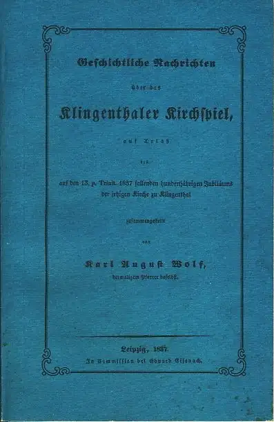Karl August Wolf: Geschichtliche Nachrichten über das Klingenthaler Kirchspiel Auf Anlaß des auf den 13. p. Trinit. 1837 fallenden hundertjährigen Jubiläums der jetzigen Kirche zu Klingenthal.