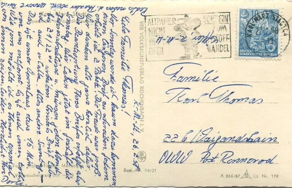 Karl-Marx-Stadt - Opernhaus in Abendbeleuchtung - Foto-AK - VEB Volkskunstverlag Reichenbach 1957 gel. 1958