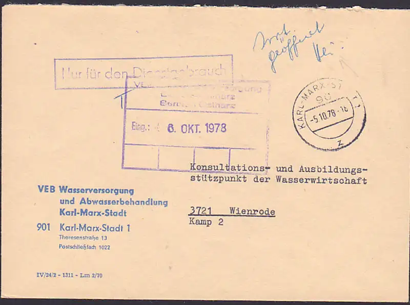 Karl-Marx-Stadt R1 NfD nach Wienrode, hier hs. "Irrt(t?mlich) ge?ffnet" und Signum