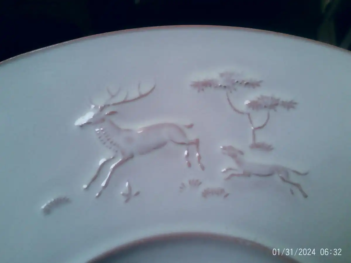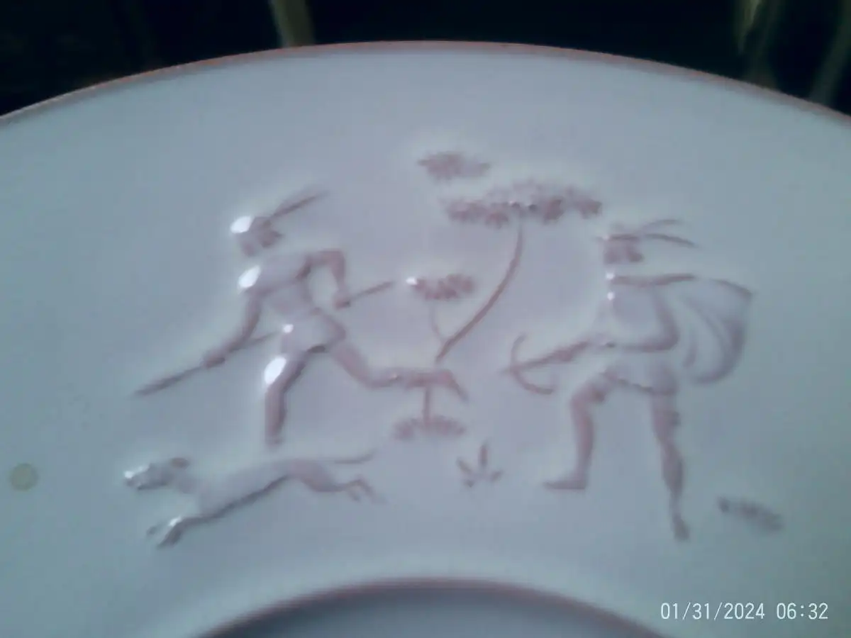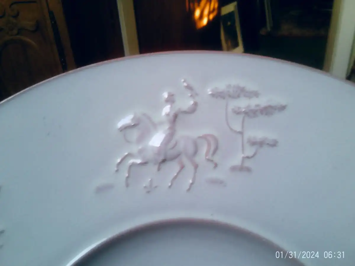 Wunderschöner, klassischer weißer Teller mit Jagdmotiven.