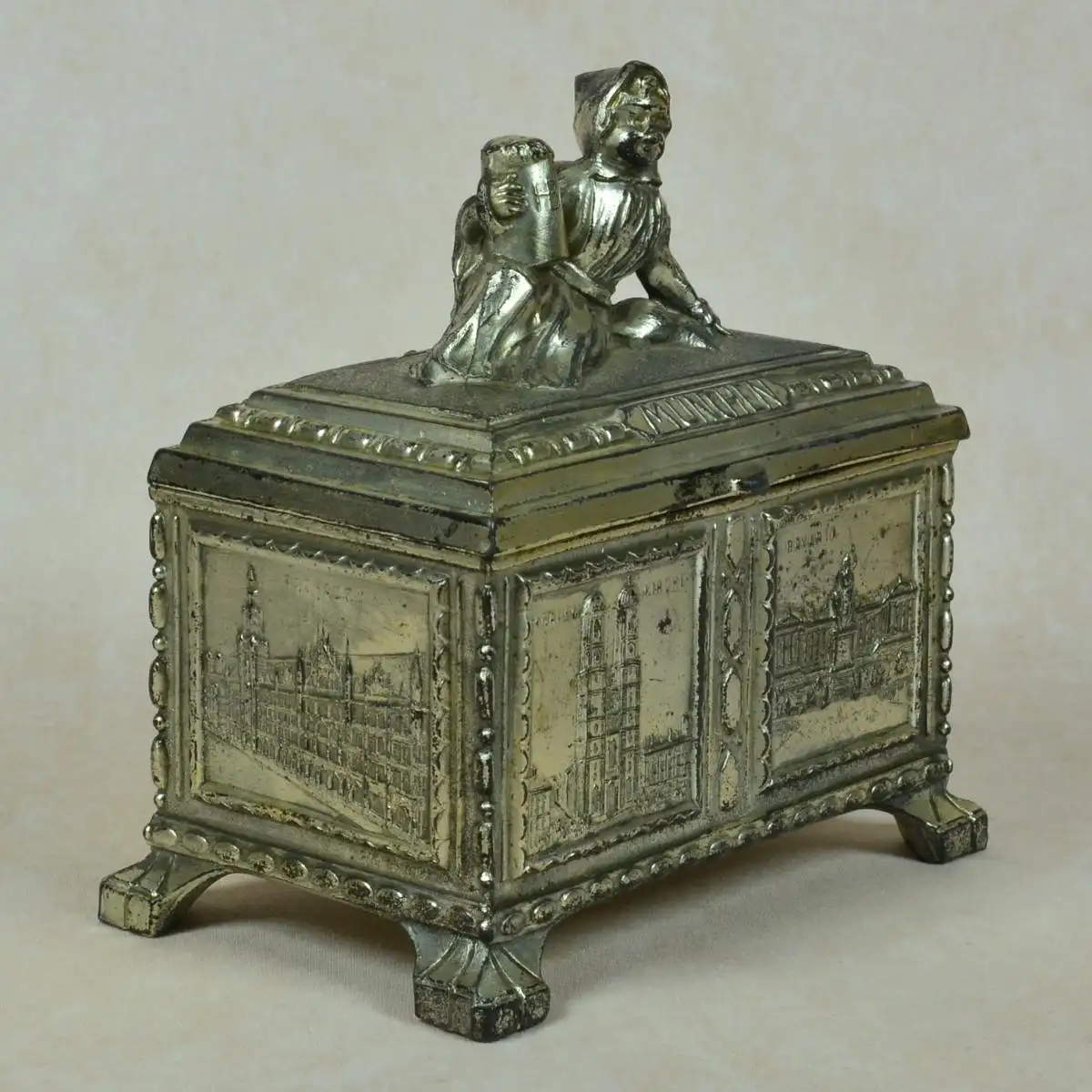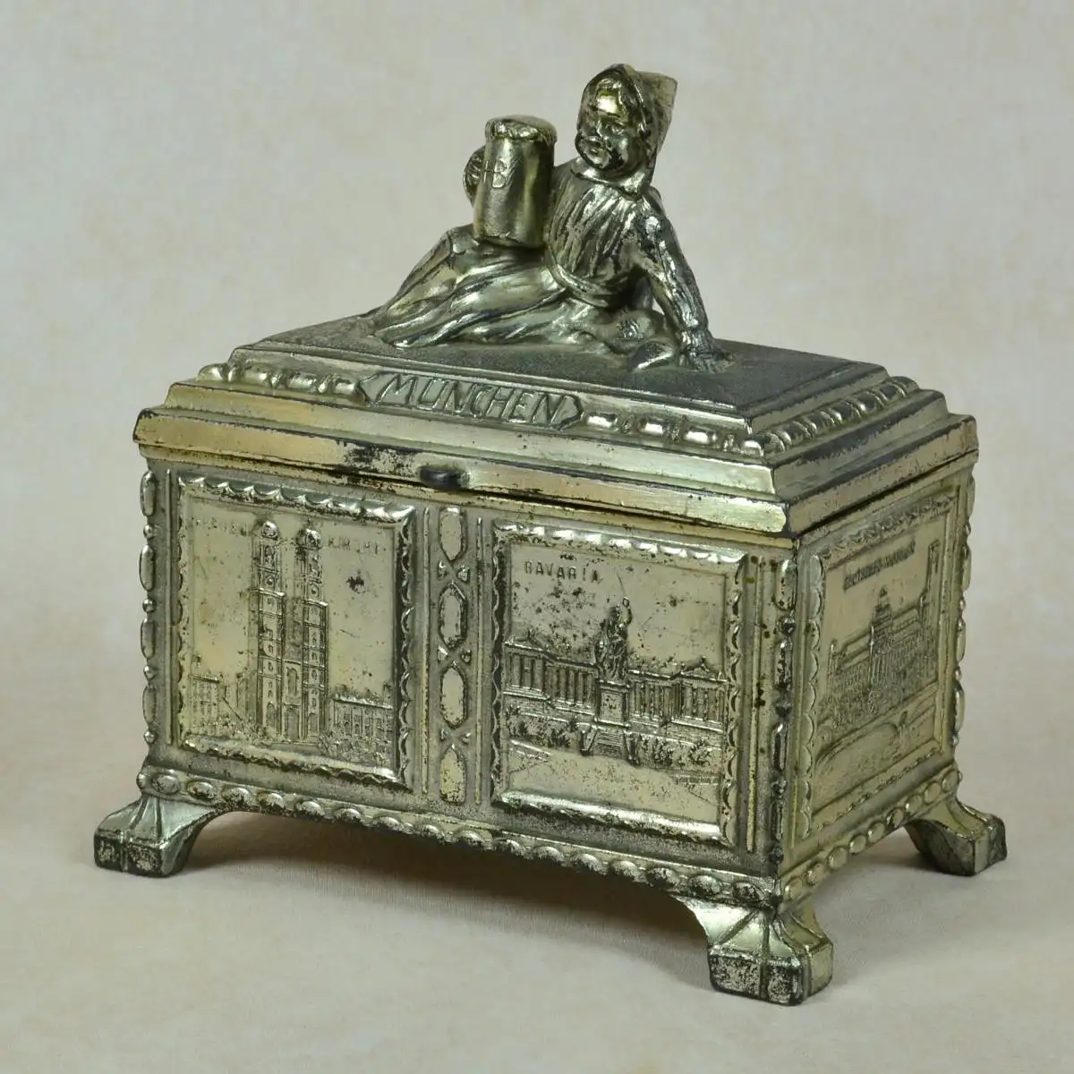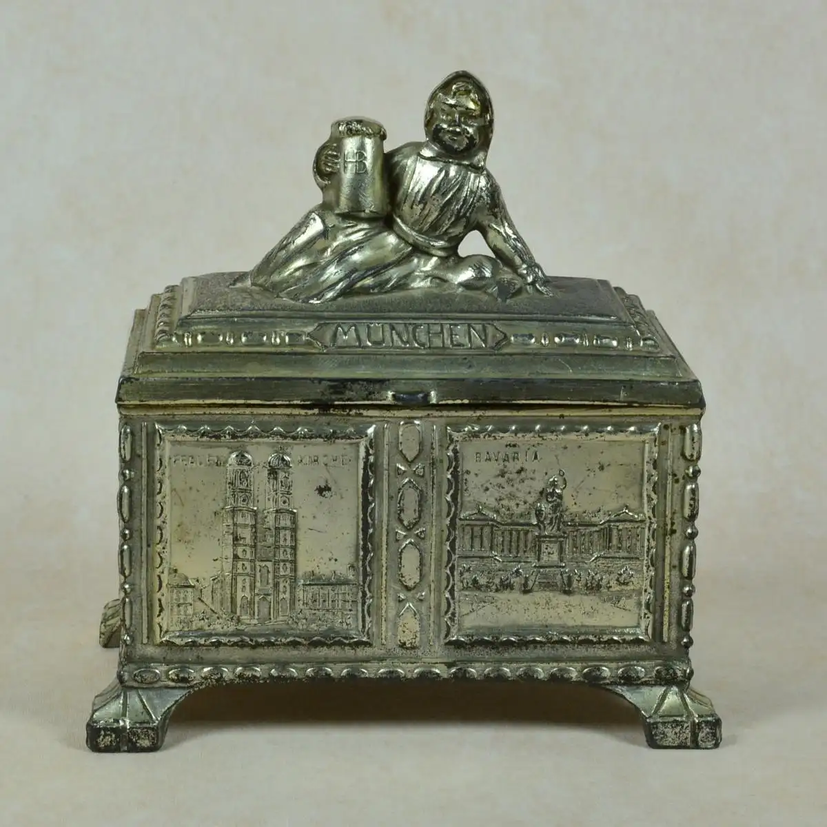 Jugendstil-Kassette aus versilbertem Graumetall, Deutschland, 1920er Jahre. Mit Gravuren von Münchner Wahrzeichen und einer sitzenden Frau mit Bierkrug auf dem Deckel, symbolisch für das Hofbräuhaus. Stoffauskleidung innen. Sehr guter Zustand mit leichten Abriebspuren. Ideal für Sammler oder als dekorativer Akzent.