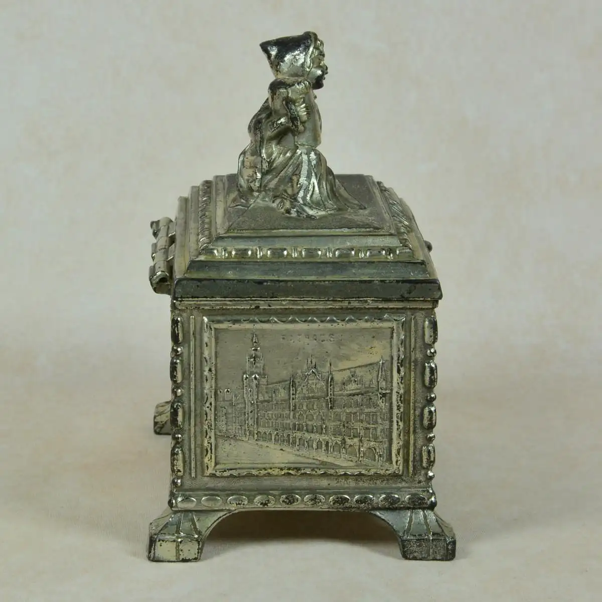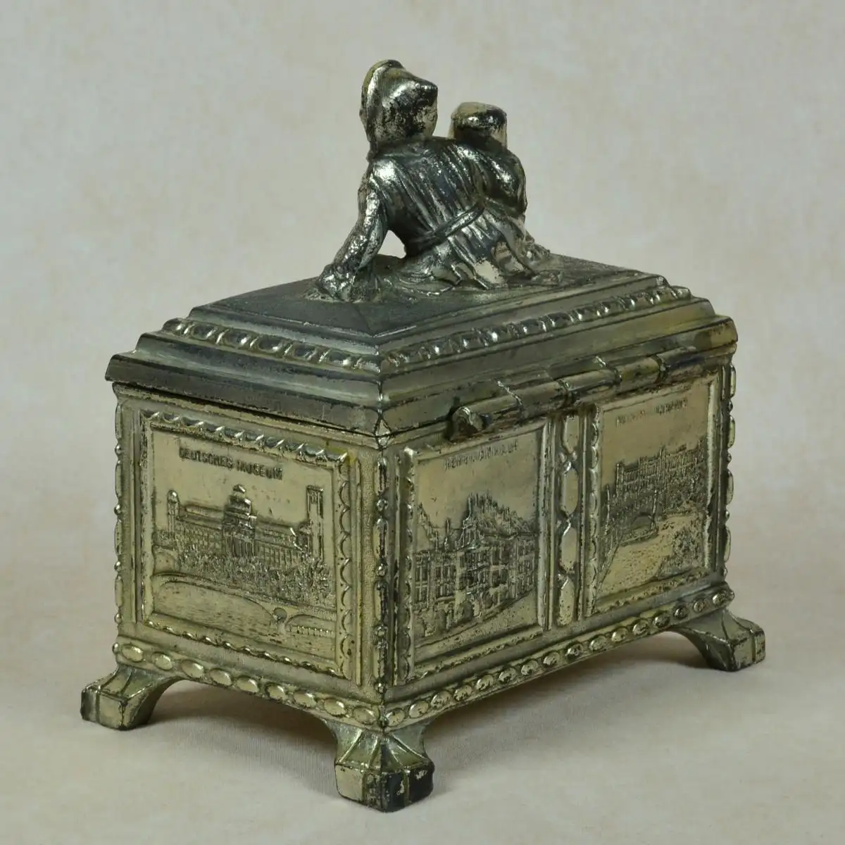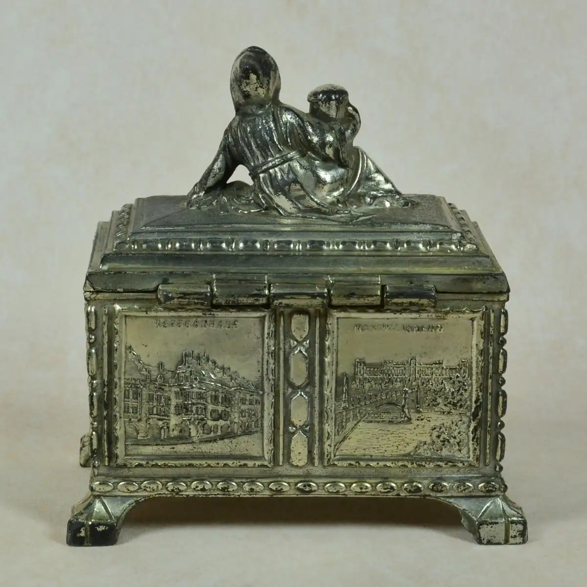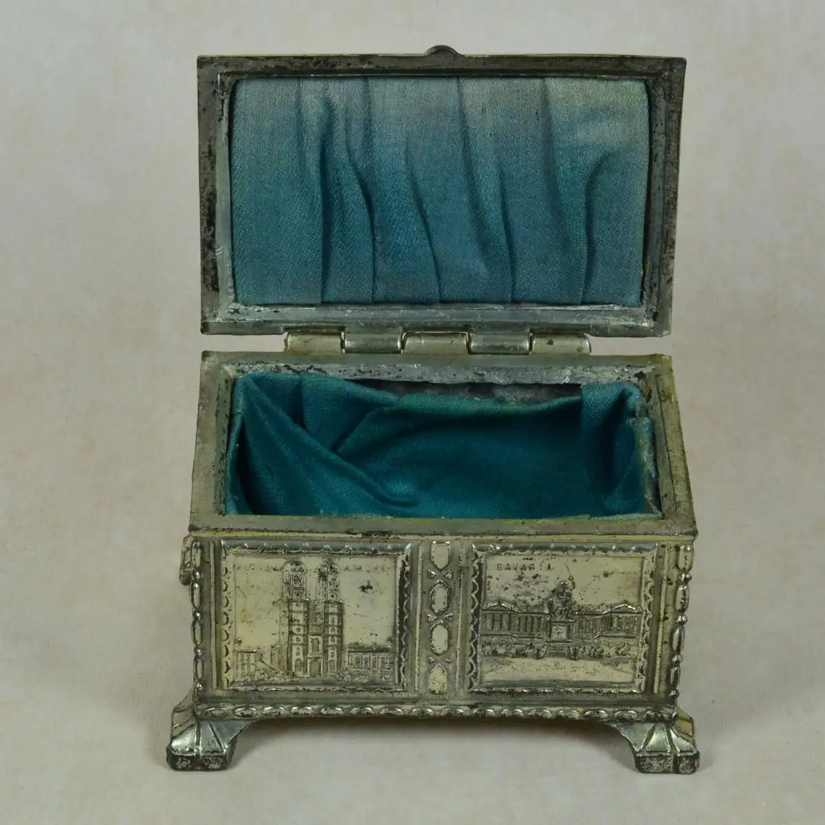 Jugendstil-Kassette aus versilbertem Graumetall, Deutschland, 1920er Jahre. Mit Gravuren von Münchner Wahrzeichen und einer sitzenden Frau mit Bierkrug auf dem Deckel, symbolisch für das Hofbräuhaus. Stoffauskleidung innen. Sehr guter Zustand mit leichten Abriebspuren. Ideal für Sammler oder als dekorativer Akzent.