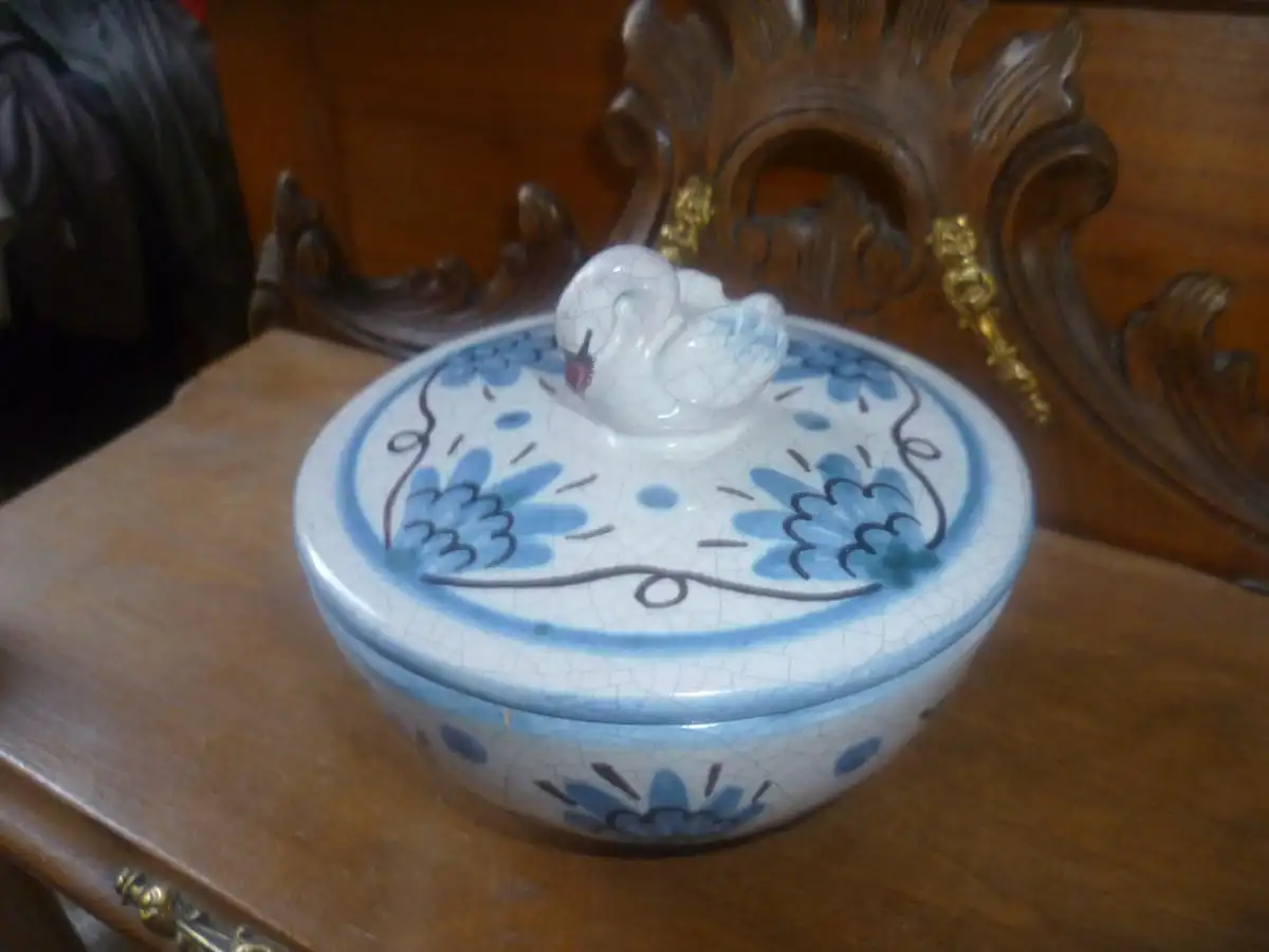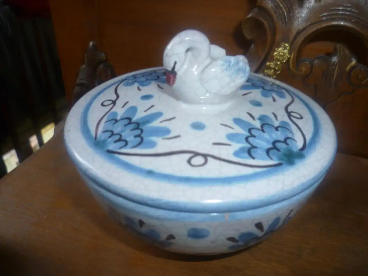 Karlsruher Majolika kleine Deckelschale mit Schwanenknauf Max Heinze 1960Ära