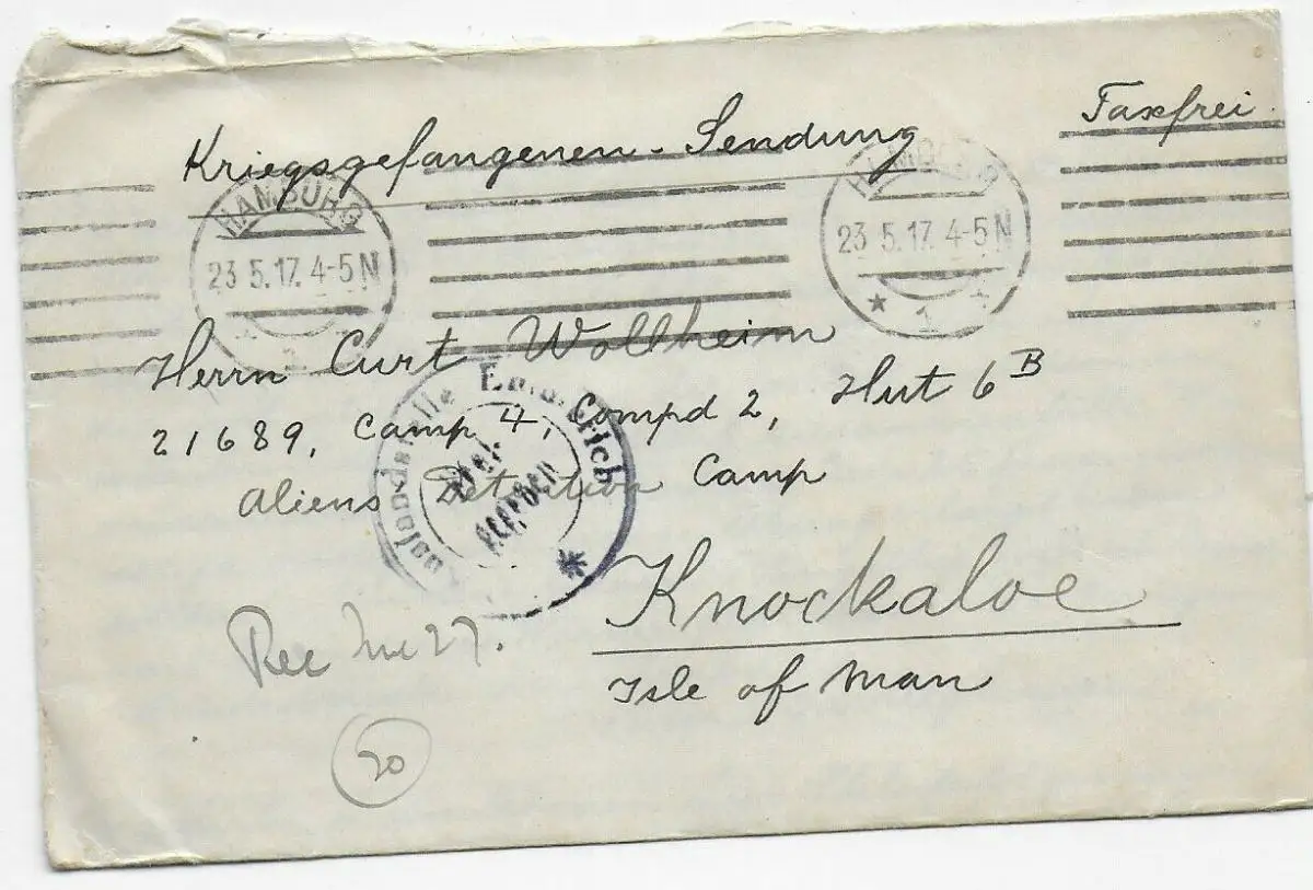 Kgf, PoW: Brief 1917 aus Hamburg nach Knockaloe Internment Camp, Isle of Man
