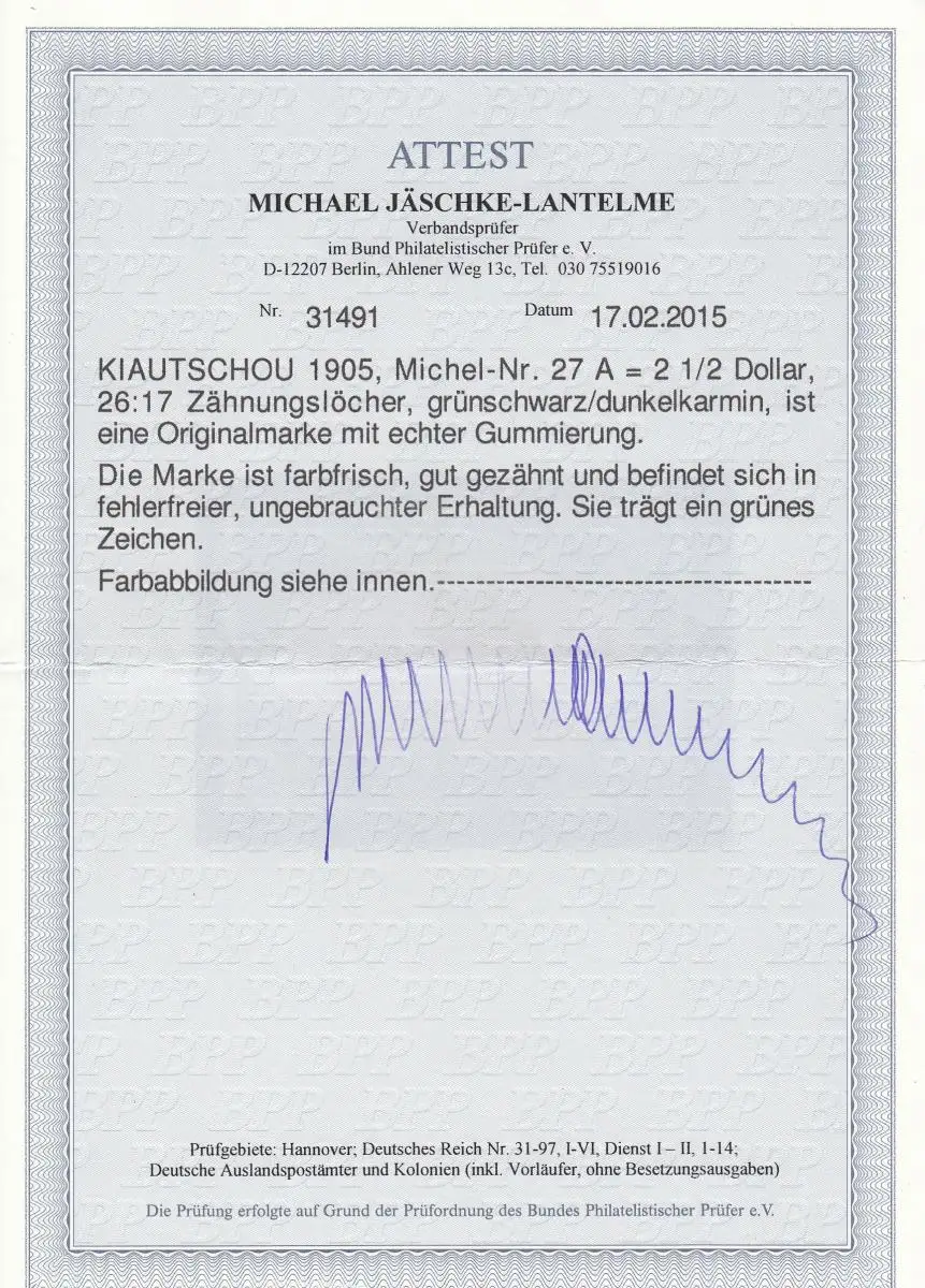 Kiautschou 1905 MiNr. 27 A, ungebraucht, BPP Attest