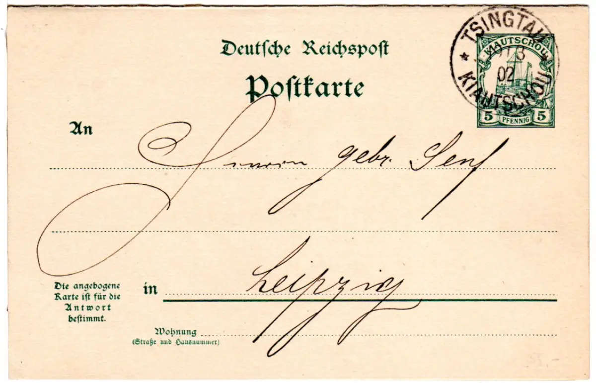 Kiautschou P3, sauber Tsingtau gestempelte 5+5 Pf. Doppelkarte Ganzsache