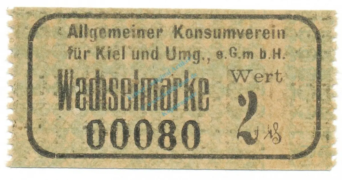 Kiel , Notgeld 2 Pfennig Schein unc-kfr. Tieste 3470.05.02 , Schleswig o.D. VerkehrsausgabeWechselmarke, Gutschein : Allgemeiner Konsumverein für Kiel und Umgebung e.G.m.b.H