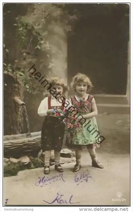 Kinder in Tracht - Blumen - Brunnen - Feldpost