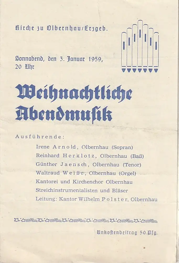 Kirche zu Olbernhau / Erzgebirge: Programmheft WEIHNACHTLICHE ABENDMUSIK 3. Januar 1959 Kirche zu Olbernhau.