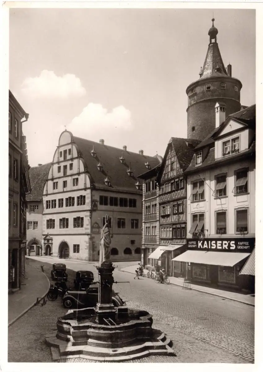 Kitzingen, Marktbrunnen m. Geschäften, Oldtimer u. Personen, ungebr sw-AK
