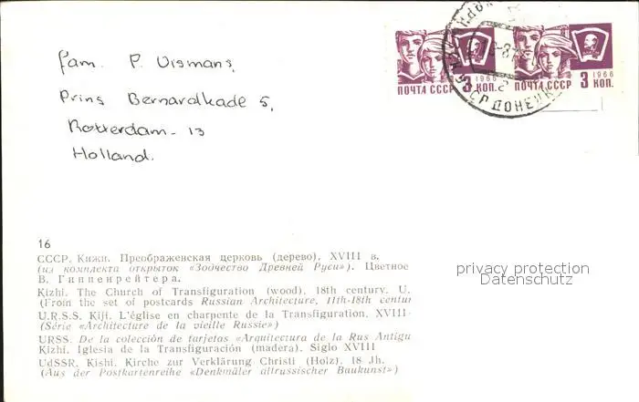 Kizhi Kischi The Church of Transfiguration Russische Foederation postalisch gelaufen nach 1965 Erhaltung siehe scans Alte Ansichtskarte Postkarte WernPID7