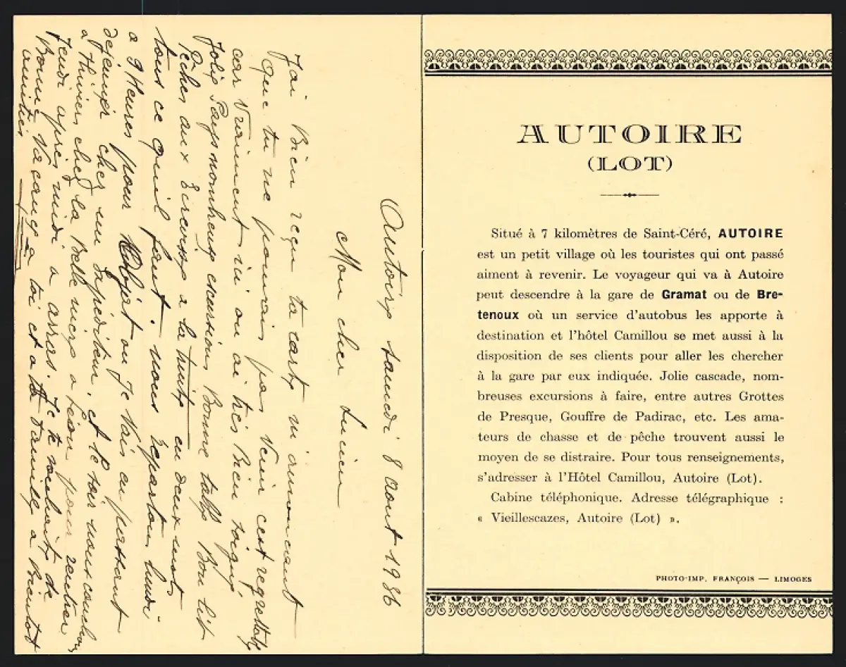 Klapp-AK Autoire /Lot, Vue générale du village et l`hôtel Chez Camillou