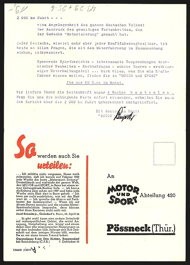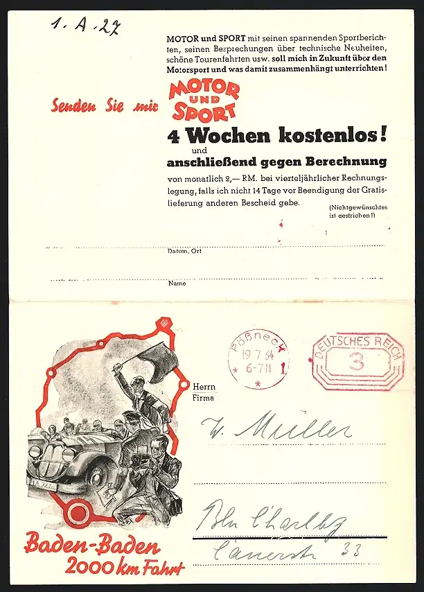 Klapp-AK Baden-Baden, Rennauto mit Startnummer 14 fährt durchs Ziel, Reklame für die Zeitschrift Motor und Sport