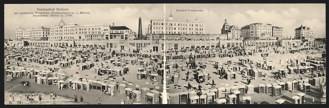 Klapp-AK Borkum, Strand-Panorama mit neuerbauter Wandelhalle