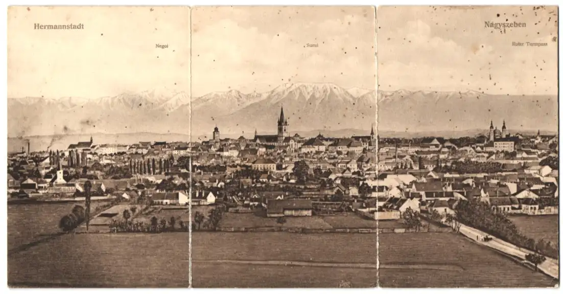 Klapp-AK Hermannstadt, Teilansicht der Stadt gegen Negoi, Surul und Roter Turmpass
