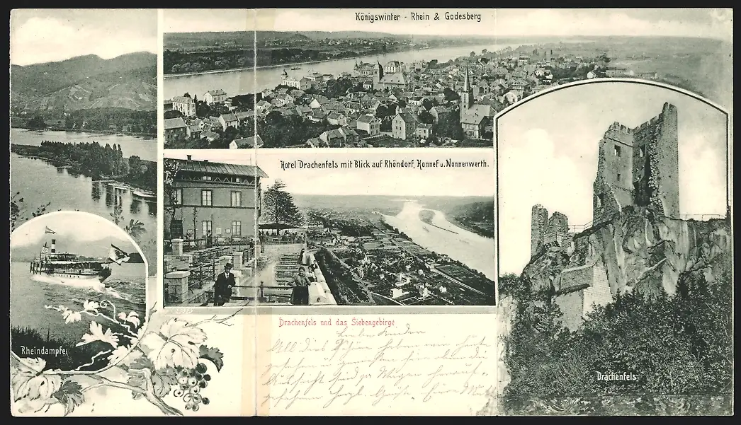 Klapp-AK Königswinter /Rhein, Ortsansicht mit Godesberg, Hotel Drachenfels, Rheindampfer