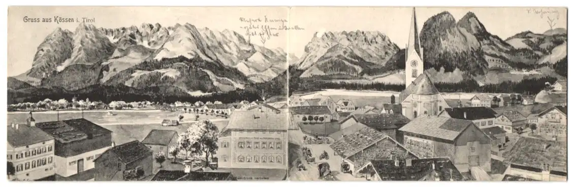 Klapp-AK Kössen i. Tirol, Gasthaus zur Post des Dominikus Gogl, Ortspanorama