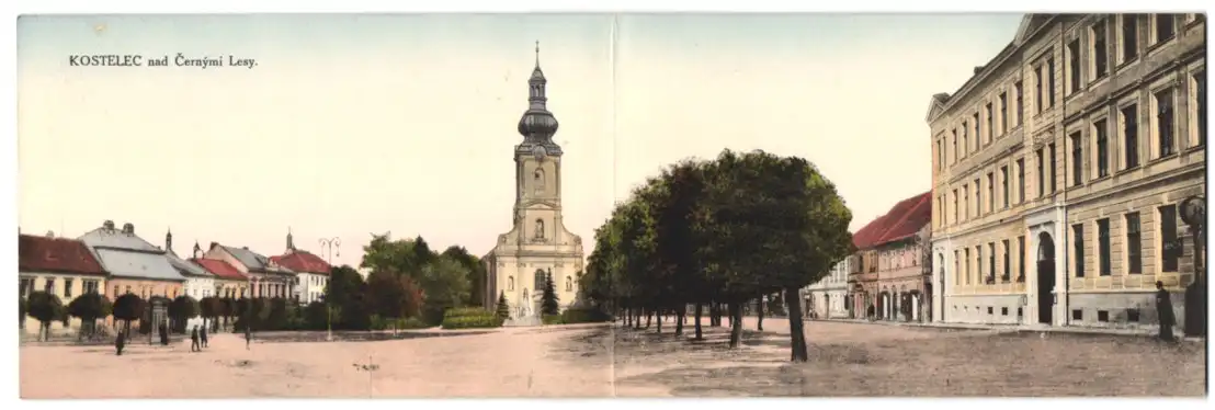 Klapp-AK Kostelec nad Cernými Lesy, Platzpartie mit Blick zur Kirche