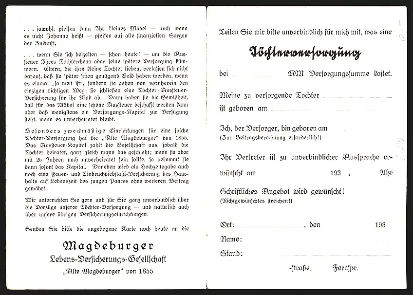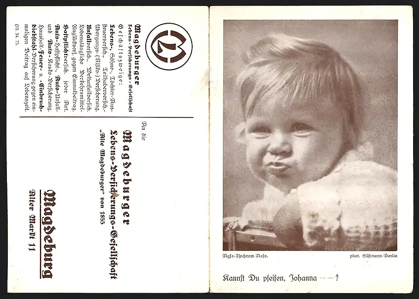 Klapp-AK Magdeburger Lebens-Versicherungs-Gesellschaft, Kleinkind Johanna versucht zu Pfeifen, Bank