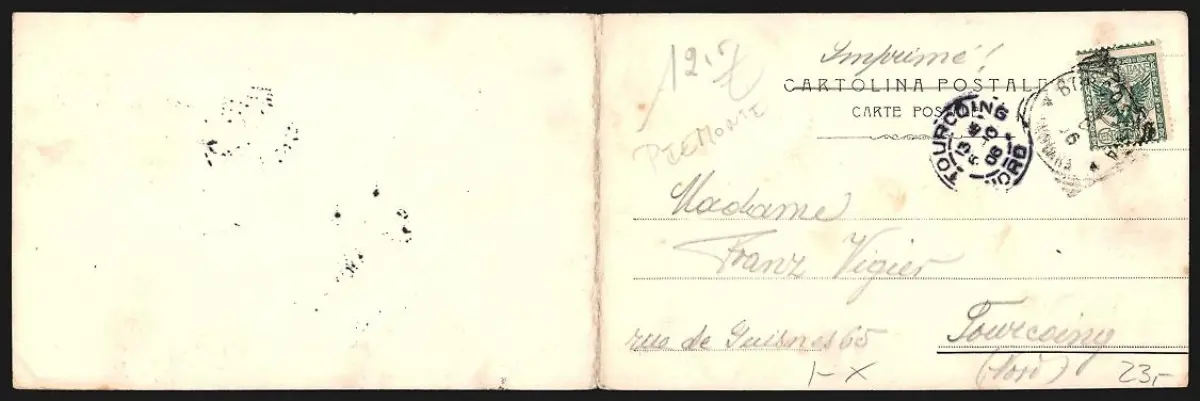 Personenbezogene Daten auf der Rückseite der Karte wurden durch blauen Textmarker unkenntlich gemacht. Die blauen Stellen sind auf die Vorderseite durchgeweicht und wirken sich negativ auf das Postkartenfoto aus
