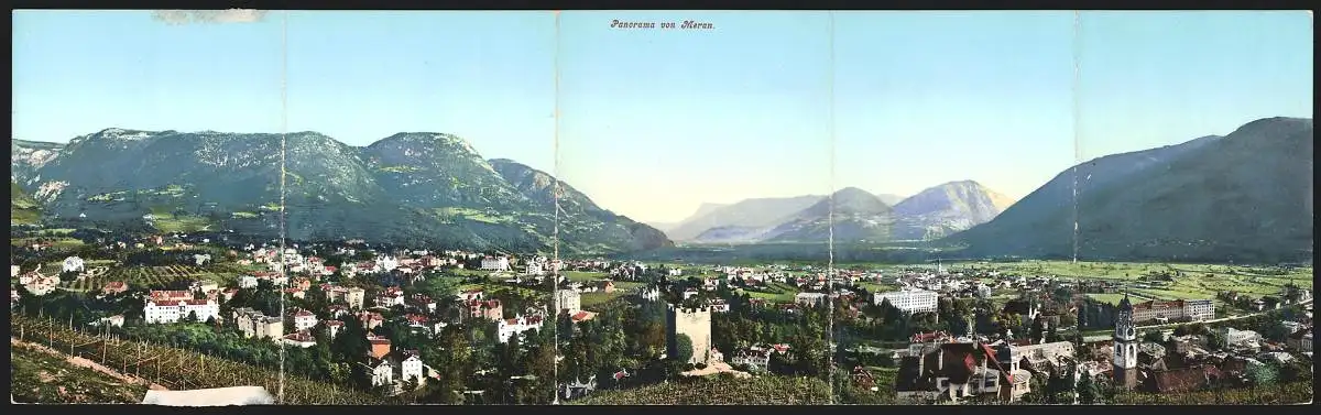 Klapp-AK Meran, Totalansicht gegen die Berge