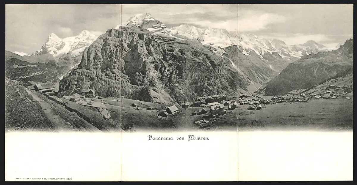 Klapp-AK Mürren, Ortsansicht mit Bergpanorama