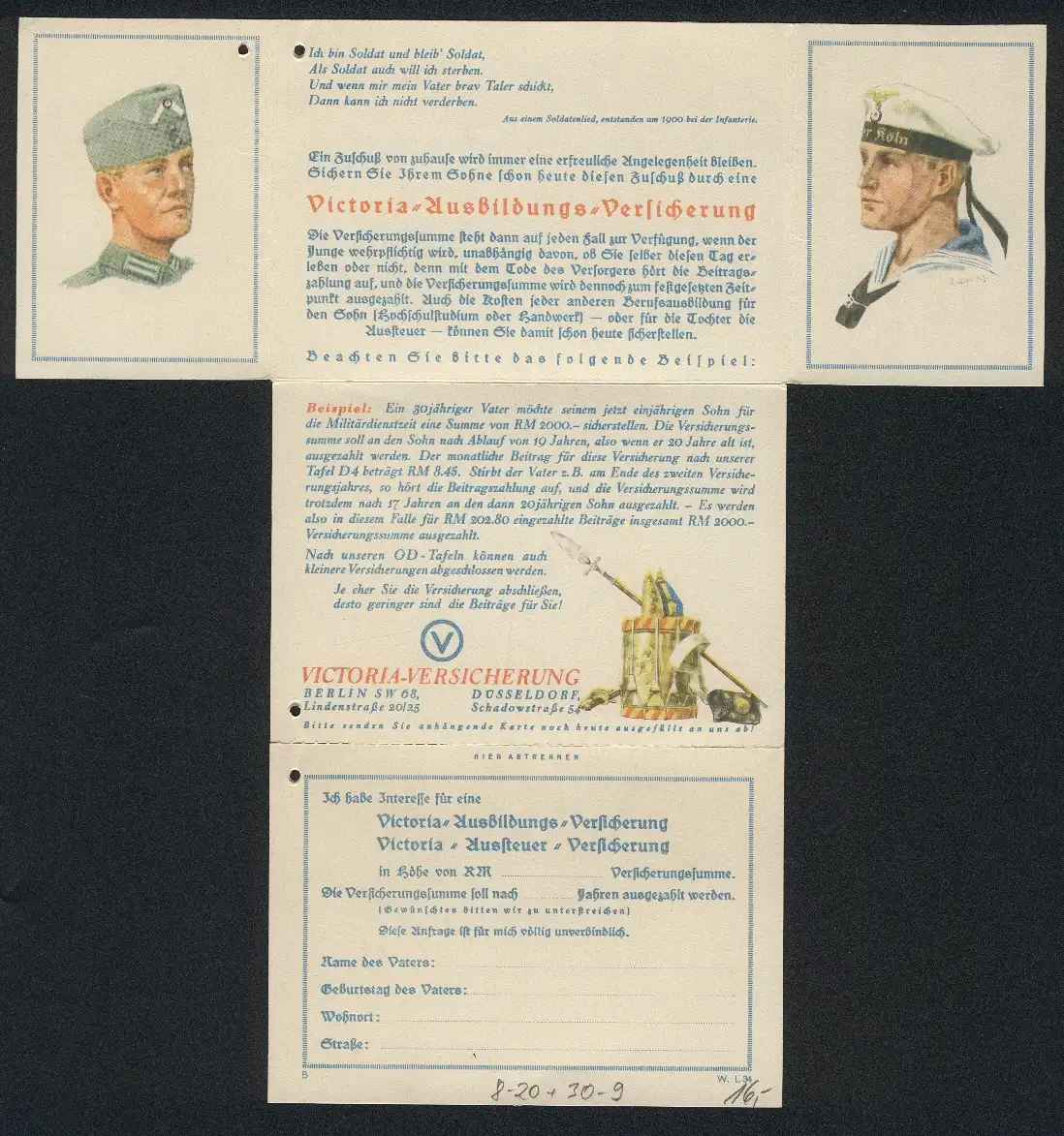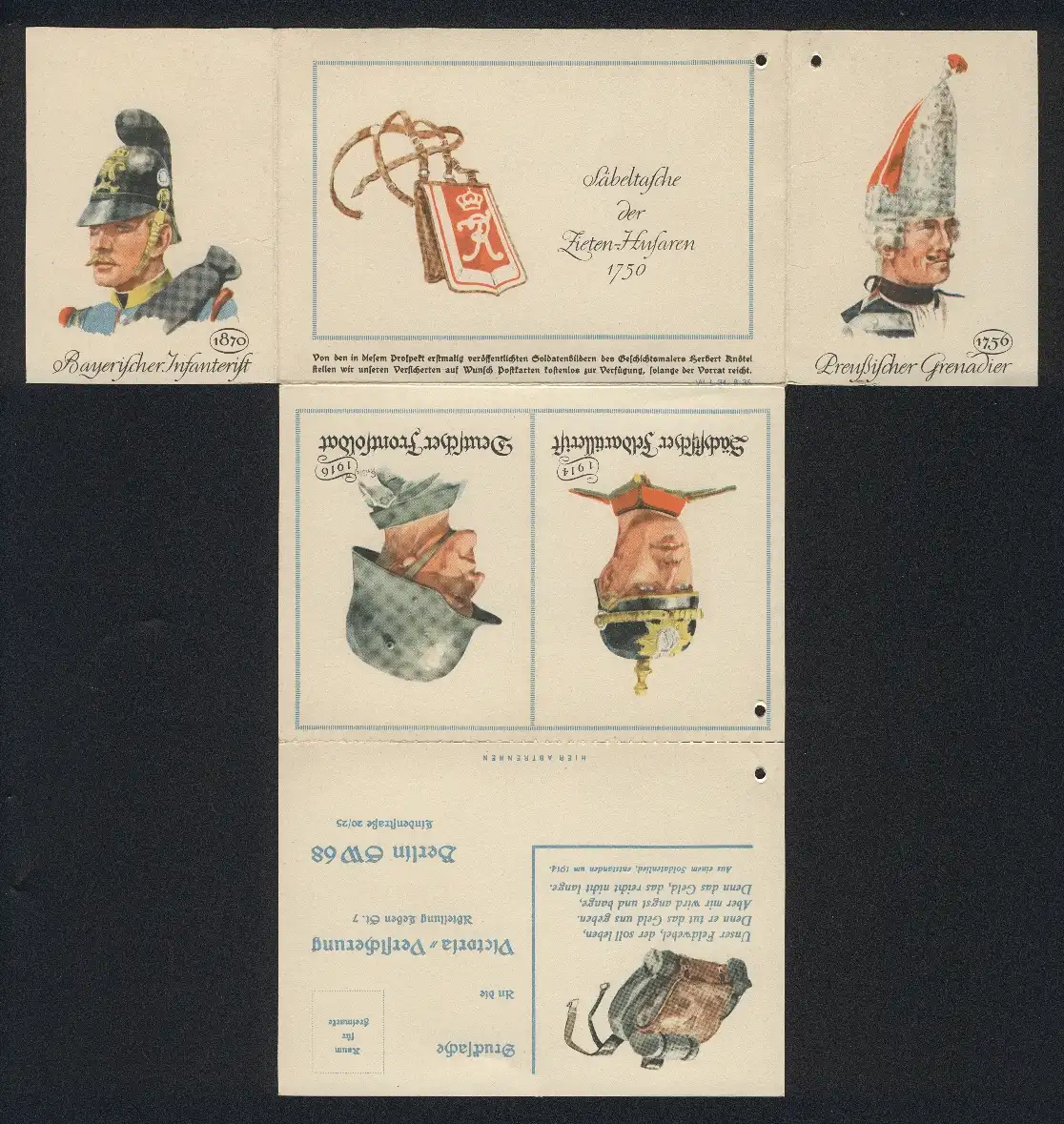 Klapp-AK Reklame d. Victoria-Versicherung, Dt. Frontsoldat 1916, Sächs. Feldartillerist 1914, Matrose d. Kriegsmarine