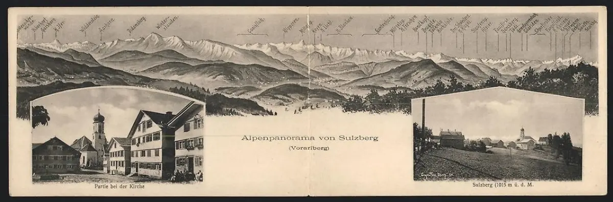 Klapp-AK Sulzberg /Vorarlberg, Alpenpanorama und Partie bei der Kirche