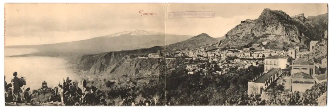Klapp-AK Taormina, Panoramablick mit Küste und Bergen